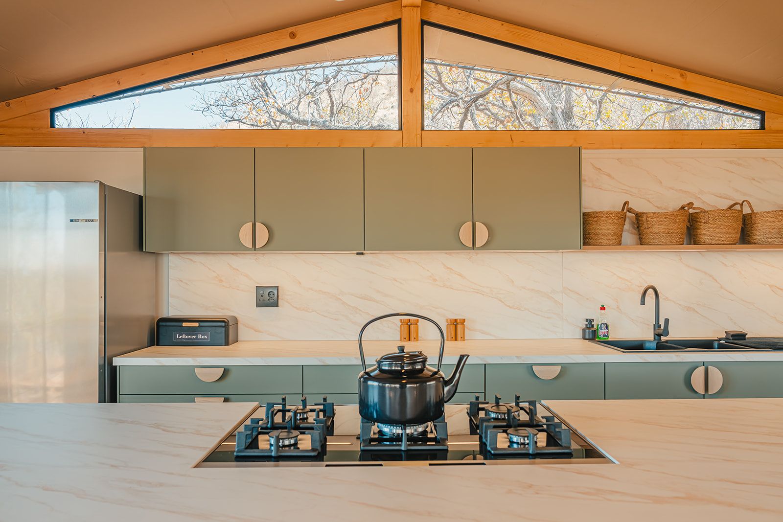 The camp’s main area features a swimming pool and a spacious communal kitchen where guests can prepare meals together as well as a shared barbecue area and a fireplace (firewood provided by the camp).