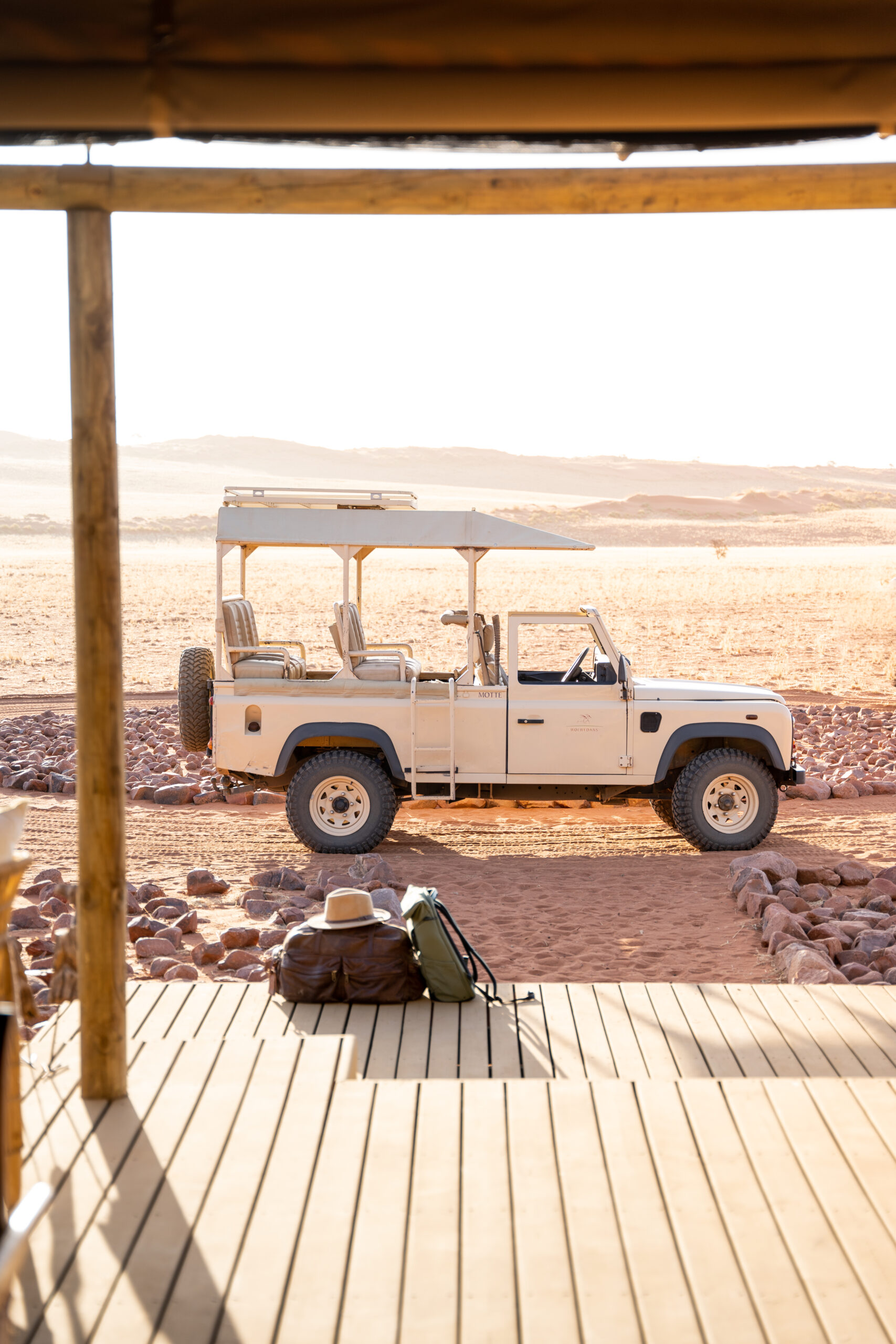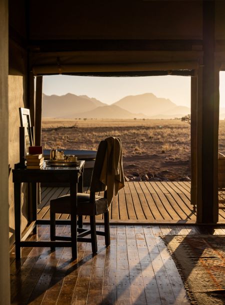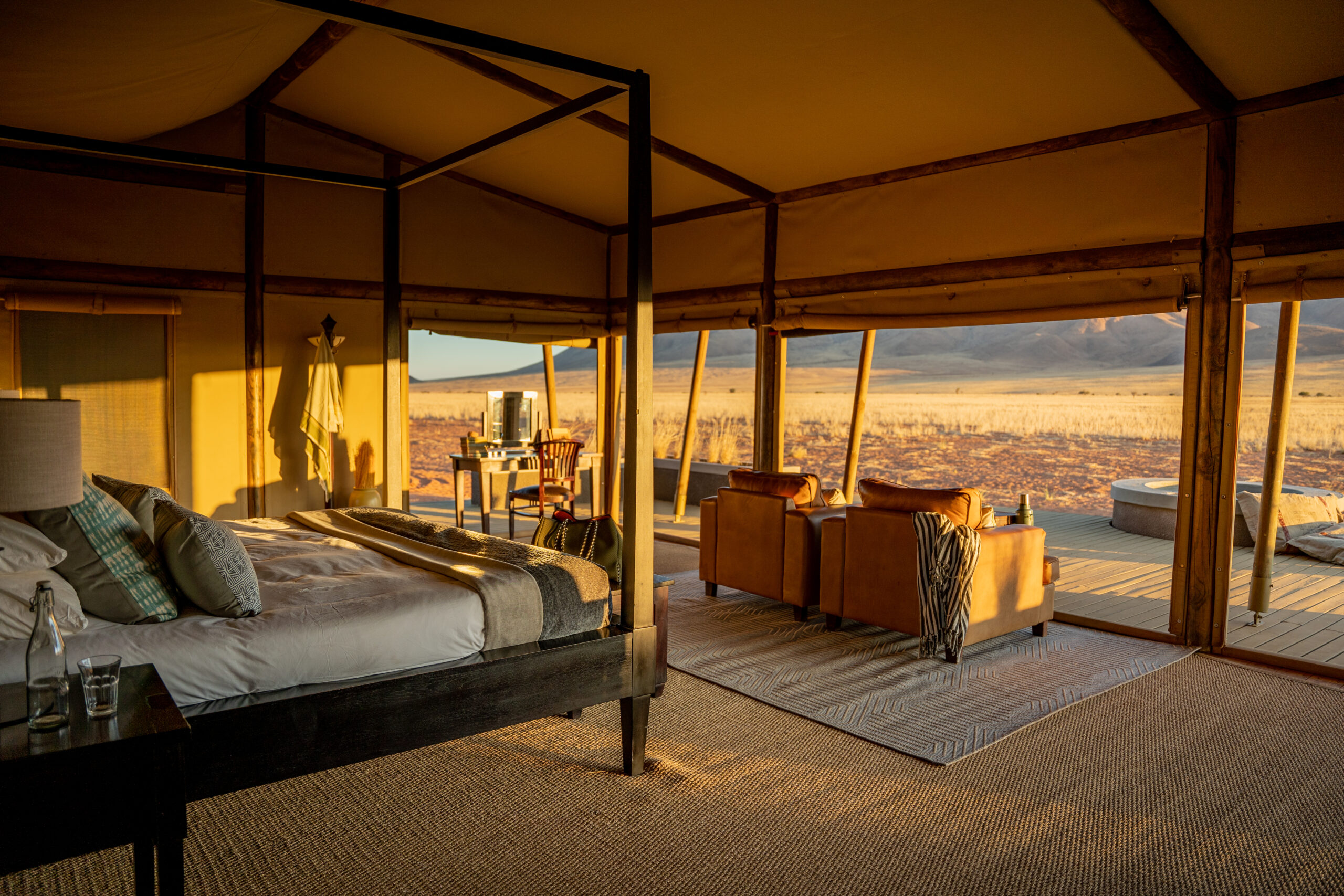 The villa’s open-plan design, utilizing canvas and timber, allows uninterrupted views of the endless plains of the Namibrand reserve.